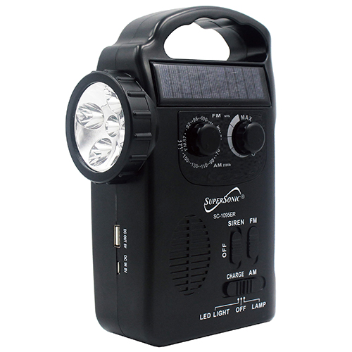 3-Way power source versatility: hand crank 3 AA batteries (not included) and AC/DC adaptor. Emergency lantern keeps you safe at home in the office or in your car. AM520-1600KHX / FM76-108 MHZ Radio. 5.5V/.22W solar panel. USB Port enables you to charge your mobile device. SOS Alarm function. Built-in rechargeable 3.6V battery. 5 LED front light and 8 LED back torch.